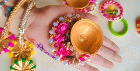 • Handmade mitti ke diye specially decor with pink flower and golden beads for make your pooja room more traditional